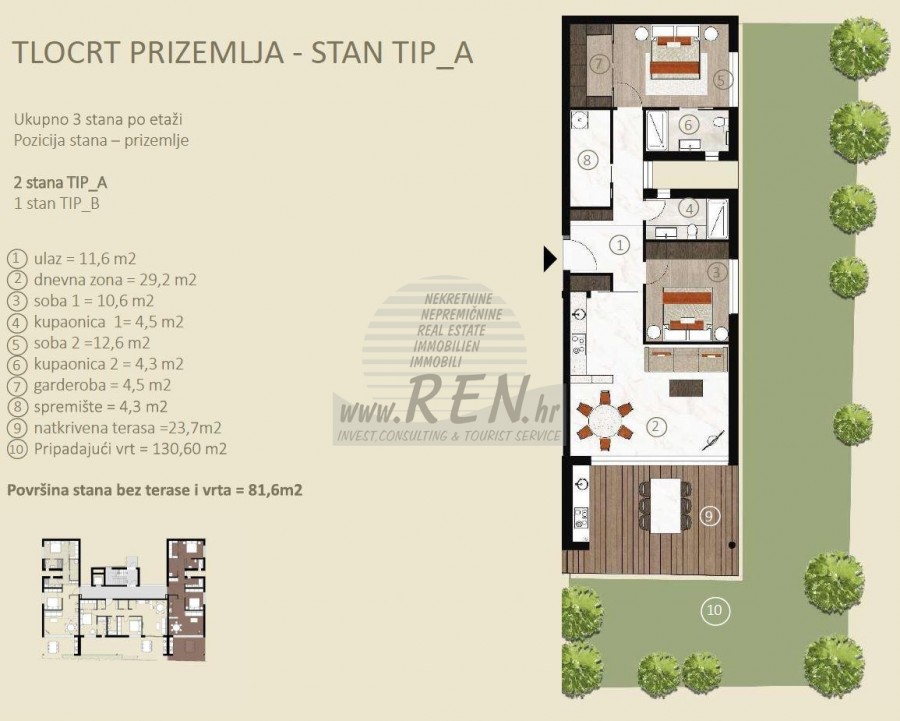 Luxus Immobilien Istrien, Zum Verkauf eine Exklusive Wohnung in Novigrad Wohnung 3 in Novigrad hat insgesamt 81,6 m2 ohne Terrasse + 130 m2 Garten, befindet sich im Erdgeschoss, Bauphase, 5 min. (1000 m) vom Meer und vom wunderschön angelegten Strand entfernt, 5 Min. (1000 m) vom Zentrum von Novigrad entfernt. Die Wohnung besteht aus einer Küche/Wohnzimmer/Esszimmer, 2 Schlafzimmern, 2 Bädern, Abstellraum, Garderobe, Terrasse 23,70 m2. Besonderheiten der Wohnung: • Gebäude mit Energieeffizienzklasse A oder A+ • Keramik der Klasse I mit größeren Abmessungen • Parkett der Klasse I mit größeren Abmessungen • Diebstahl- und Brandschutztüren • Sanitärartikel von Hansgrohe und Catalano • Video-Gegensprechanlage • Videosicherheitssystem am Eingang • Umzäunte Müllentsorgung • Eingangstor für Fußgänger • Einfahrtstor • Lagerung für jede Wohnung • Platz für Fahrräder • Innenparkplatz • Überdachte Parkplätze oder Garagen • Fußbodenheizung • Vorbereitung für Dachsolarpaneele • Vorbereitung für Ladegeräte für Elektroautos • Satz Außenbeleuchtung von Wohnungen und Gebäuden • Breite Eingangshalle • Aufzug • PVC/ALU-Zimmerei • Terrassenbeläge auf den Terrassen • Terrassendeckenverkleidung • Vorbereitung für die Küche auf der Terrasse • Kaminanschluss • Entwässerung für jede Haube bis zum Ausgang zur Fassade oder zum Dach • Automatische Bewässerung gemeinsam genutzter Grünflächen Oberfläche • Automatische Bewässerung der Grünflächen von Wohnungen in Erdgeschoss Heizung und Kühlung über das DAIKIN-Multisplit-System aus Innen- und Außengeräten, Umwälzpumpen für Warmwasser in der gesamten Wohnung, individuelle Thermostate und Temperaturregelung für jeden Raum, Fernsteuerung des Heiz- und Kühlsystems per Smartphone, Außengeräte auf dem Dach Das Gebäude, Wohnungen im Erdgeschoss auf einer Grünfläche. Farbvideo-Gegensprechanlage, optisches Kabel zu jeder Wohnung geliefert. Die Gewährleistung auf das Bauwerk beträgt 10 Jahre, auf Bau- und Handwerksarbeiten 2 Jahre und auf Geräte und Geräte die Gewährleistungsbedingungen des Herstellers. Für weitere Auskünfte stehen wir Ihnen gerne zur Verfügung.