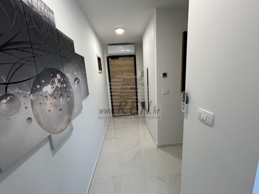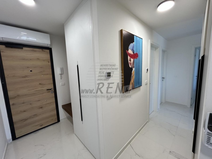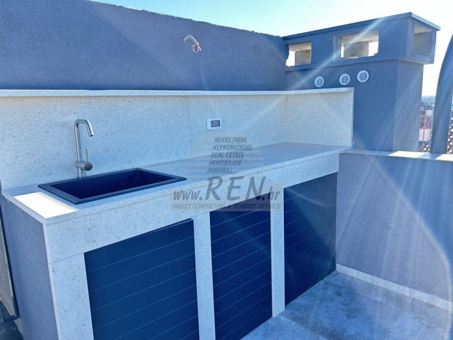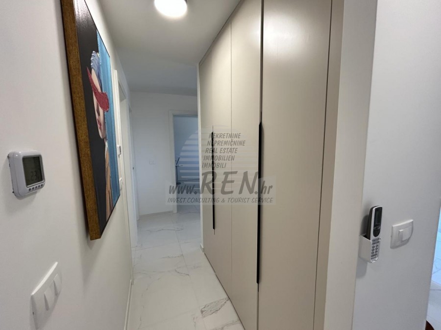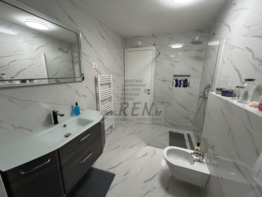 Gelegenheit zum Kauf einer Wohnung in einem hochwertigen Neubau mit Aufzug in Novigrad. Das Besondere daran ist, dass das gesamte Gebäude aus Beton besteht und mit Aluminiumfenstern und 3-Schicht-Glas ausgestattet ist, was es äußerst hochwertig macht. Die Wohnung befindet sich im 2. Stock und hat 72 m2 + eine Dachterrasse von 60 m2. Die Wohnung besteht aus einer Eingangshalle, einem Badezimmer, zwei Schlafzimmern und einem offenen Bereich mit Küche, Esszimmer und Wohnzimmer mit Zugang zu einer überdachten Terrasse mit herrlichem Meerblick. Jedes Zimmer der Wohnung ist mit Klimaanlage und Fußbodenheizung ausgestattet. Ein Kamin ist ebenfalls vorhanden. Es besteht die Möglichkeit, einen Kamin oder Pelletofen einzubauen. Die Wohnung verfügt über eine große Dachterrasse mit Panoramablick auf das Meer, eine Sommerküche sowie Anschlüsse für eine Dusche und einen Whirlpool. Zur Wohnung gehören ein überdachter Parkplatz und ein gemeinsamer Fahrradabstellraum vor dem Gebäude. Die Wohnung ist mit hochwertigen Möbeln ausgestattet und wird voll möbliert verkauft.