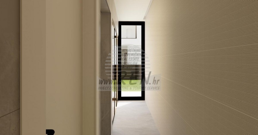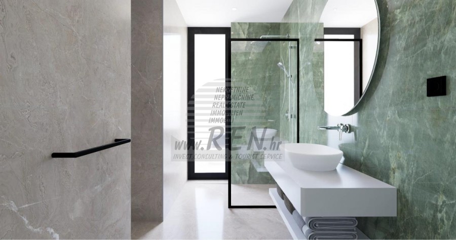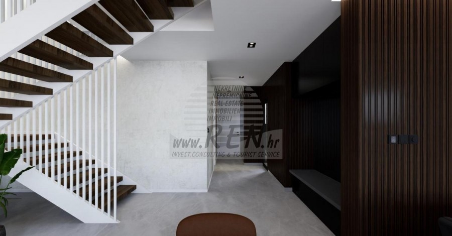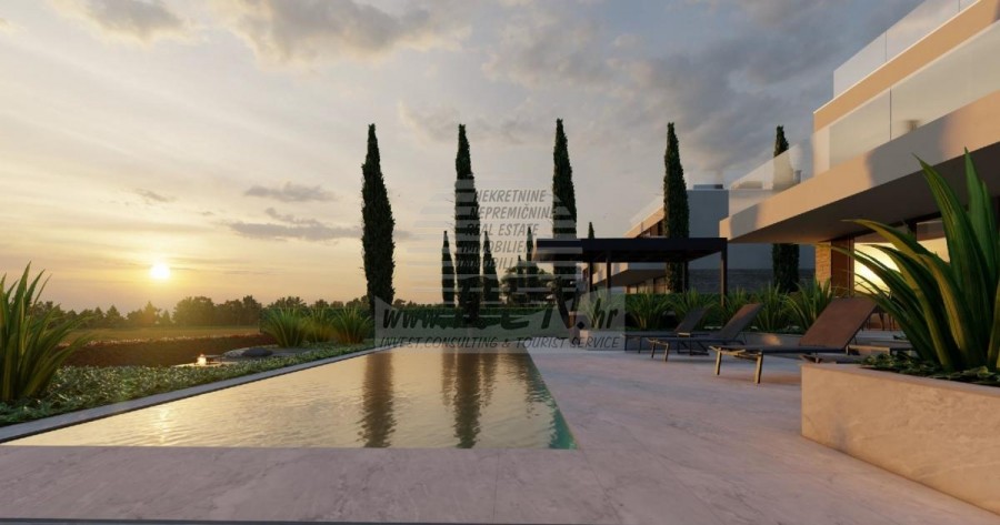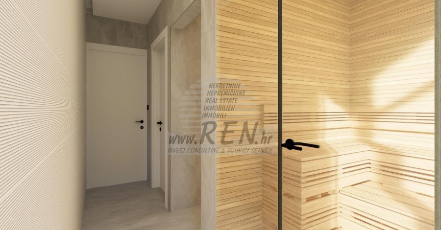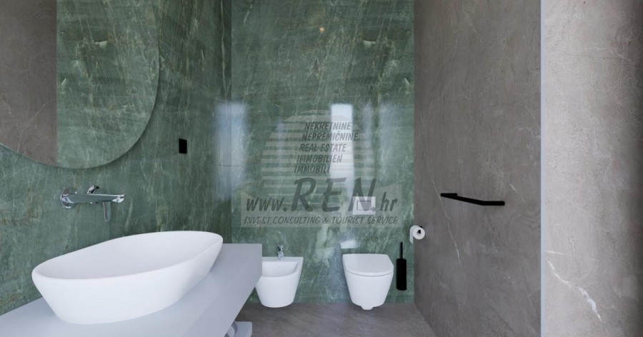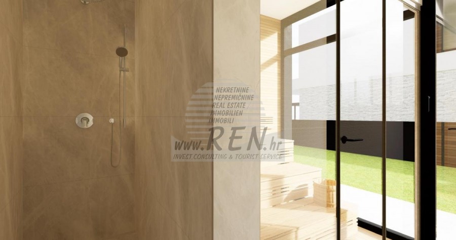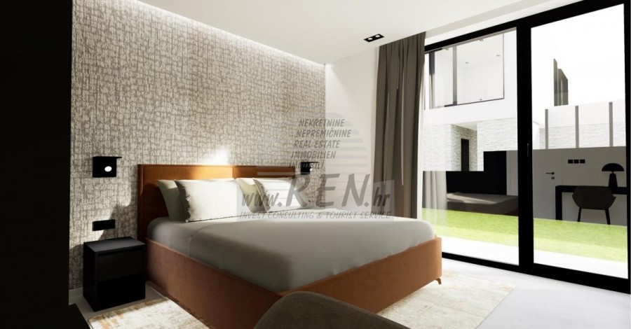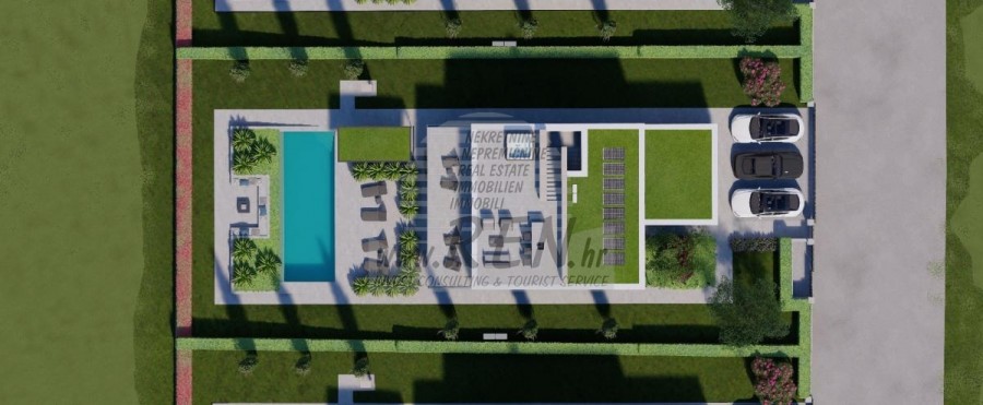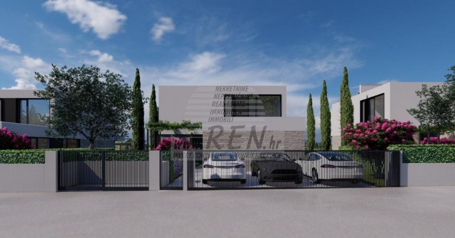 Der Villenkomplex befindet sich auf einer Fläche von 3730 m2. Es besteht aus 4 freistehenden, komplett möblierten und ausgestatteten Gebäuden mit Blick auf das offene Meer. Bruttowohnfläche jedes Hauses: 270 m2 (es zählen nur geschlossene Flächen) Netto-Innenwohnfläche: 204 m2 (geschlossener Teil) Netto, offen überdacht und nicht überdacht: 310 m2 (Sonnenliege, Überdachung, Balkone, Wege, Feuerstelle, Dachterrasse, Außentreppe) Parken: 3 Parkplätze (40 m2), jedes Haus. Schwimmbad: 36 m2 Wasserfläche Villa Parenzo eins - Grundstück 864 m2 - Grünfläche 328 m2 Energieklasse: A (20 kWh/m2 pro Jahr) Grundriss: P+1, (Erdgeschoss + Obergeschoss) Das Erdgeschoss besteht aus einer Eingangshalle, einer Treppe für den Zugang zum ersten Stock und der Dachterrasse, einem Wohnzimmer, einer Küche und einem Esszimmer, einem Schlafzimmer mit separatem Badezimmer, einer zusätzlichen Toilette, einem Badezimmer und einer Sauna. ein Technikraum mit Waschküche, ein Abstellraum und eine Außentoilette, die jeweils über einen separaten Eingang verfügen. Im ersten Stock gibt es eine Treppe, einen Flur, drei Schlafzimmer mit separaten Badezimmern und einen Fitnessraum. Es gibt auch Zugang zur Dachterrasse, wo sich eine Außenbar, eine Liegewiese und eine Hydromassagewanne befinden. In der Umgebung gibt es einen beheizten Außenpool, eine Liegewiese, eine überdachte Terrasse zum Essen, eine Überdachung mit Sommerküche und eine nicht überdachte Terrasse direkt neben dem Pool. Im unteren Teil des Hofes befindet sich eine Feuerstelle. Im Innenhof gibt es außerdem eine Designer-Außendusche mit Warmwasser und einem Bodensiphon. Die gemietete Stromleistung beträgt 18,86 kW – dreiphasig, für jedes Haus. Außenschreinereiarbeiten: Großformatiger Aluminium-Schlosser. Aluminiumprofil - ALIPLAST. Glas SUNGUARD SN 70/35 HT 6 mm gehärtet (70 % Lichtdurchlässigkeit, 35 % Solarfaktor). 1,0 W/m²K (U-Wert) + 16 mm Al schwarz, PU, Argon + FLOAT CLEAR, 6 mm gehärtet. Profile mit unterbrochener Wärmebrücke, plastifiziert (RAL 7016). Alle Türen, Fenster und Festpositionen werden im ALIPLAST SUPERIAL 800- und SUPERIAL-System hergestellt (Rahmentiefe 75 mm, Flügeltiefe 75 mm). Die Schiebepositionen werden im ULTRAGLIDE-System (Rahmentiefe 154 mm) hergestellt. Der Wärmedurchgangskoeffizient liegt für alle Positionen unter 1,3 W/(m2*K). Wanddämmung: Erdgeschosskombination aus Styrodur XPS 8 cm + Steinverkleidung 5 cm und Styropor EPS 10 cm, dort wo kein Stein vorhanden ist. Böden aus Styropor EPS 16 cm – weiße Fassade und Styropor 10 cm auf anthrazitfarbenen Teilen. Handbehauener Kanfanar-Stein, 5 cm dick. Heizung: Vailant, externe Luft-Wasser-Wärmepumpe mit Stromantrieb – 10,3 kW Heizsystem und Warmwasseraufbereitung der Energieklasse A++, mit zusätzlichem Maschinenraum im Haus und einem 300-Liter-Boiler und Zirkulation. Fußbodenheizung in allen Räumen mit separaten Raum-/Badreglern. Mögliche Fernbedienung über Wi-Fi-Netzwerk. Kühlen/Aufwärmen: Es wurde ein Samsung Multi Split System mit zwei Außengeräten und 6 Innengeräten installiert. Ausgestattet mit der Möglichkeit, den Raum auf bis zu -30 °C Außentemperatur zu kühlen und zu heizen. Darüber hinaus verfügen die Geräte über die Wind-freeTM-Technologie für einen angenehmen Luftstrom. Mögliche Fernbedienung über Wi-Fi-Netzwerk. Ausrüstung: • Hochwertige Sanitärausstattung von Duravit, Wasserhähne von Grohe, Entwässerungssysteme von Geberit und Tece, Spülkästen von Grohe, begehbare Dusche. • Hochwertige Keramik von den bekanntesten italienischen Herstellern (Graniti Fiandre, Panaria, Keope, Love). In den Bädern großformatige Keramik, bis zur Decke platziert. • Eingebautes System zur Wasserenthärtung aus dem Wasserversorgungsnetz. • Integriertes High-End-Ajax-Alarmsystem mit Bewegungssensor, Wasserleckdetektor und Feuermelder. Ausführung in Schwarz. • DVC-Videoüberwachung mit 2 TB HDD-Recorder und 4 externen IP-Kameras mit 5 Mpx. • Beleuchtung vom österreichischen Hersteller Eglo. • Interne Schalter, Knöpfe und Steckdosen der italienischen Marke Bticino der Legrand-Gruppe. • Eingebaute komplette Antennen- und Satellitenanlage für jeden Raum. • Eingebaute zusätzliche WLAN-Signalverstärker im Haus und auf der Außenterrasse. • Innentüren des bekannten italienischen Herstellers Braga mit verdeckten Scharnieren und Magnetschlössern, 44 mm breit, Bianco Matrix-Design mit schwarzen Prisma-Griffen. • Video-Gegensprechanlage mit Steuerung zum Öffnen der Vordertür und elektronischer Steuerung. das Tor. • Wallbox-Ladegerät zum Laden von Mercedes-Benz Elektroautos bis 22 kW • Biokamin im Wohnzimmer • Außenrinnen und Abflüsse auf Terrassen und Balkonen des deutschen Spitzenherstellers Aco • Glasgeländer auf Balkon und Dachterrasse Küche und Möbel • Dan Kuchen Küche, Modell Silbermond in Anthrazit-Version – Küche und Insel, mit Sapienstone – Fior di Bosco Keramikarbeitsplatte 12 mm dick. • Die Küche ist mit allen notwendigen Einbaugeräten von Bosch ausgestattet (Backofen, Mikrowelle, Herd, Geschirrspüler und kombinierter Kühlschrank). • Auf der Insel ist auch ein Weinkühlschrank der Marke Candy installiert. • Franke-Spüle, Grohe-Wasserhahn, Faber-Haube mit Belüftungskanal. • Waschmaschine und Wäschetrockner Bosch, Serie 6, beide mit einem größeren Fassungsvermögen von 9 kg, in einem speziell dafür vorgesehenen Schrank im Technikraum untergebracht. • Smart-TV in allen Zimmern, die Größe im Wohnzimmer beträgt 75'' QLED 4K und alle anderen Zimmer haben TV-Größen 55'' UHD LED 4K. • Die Schlafzimmer sind mit Doppelbetten mit Premium-Matratzen der Linie Hespo Luxury Plus, Einbauschränken, einem Schreibtisch mit einem Kave Home-Sessel und Nachtlampen ausgestattet. • In allen Räumen wurden Piere-Cardin-Teppiche verlegt, und ein Teil der Wände ist mit Lamelio Milo-Lamellen in Walnussfarbe und Wandtapeten der deutschen Marke Hohenberger verkleid