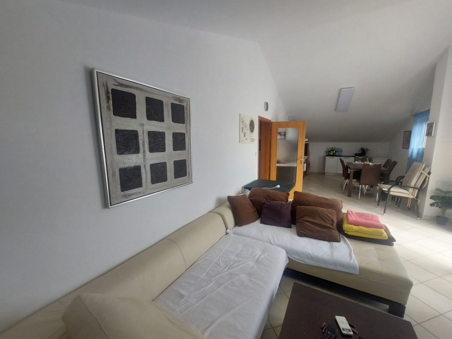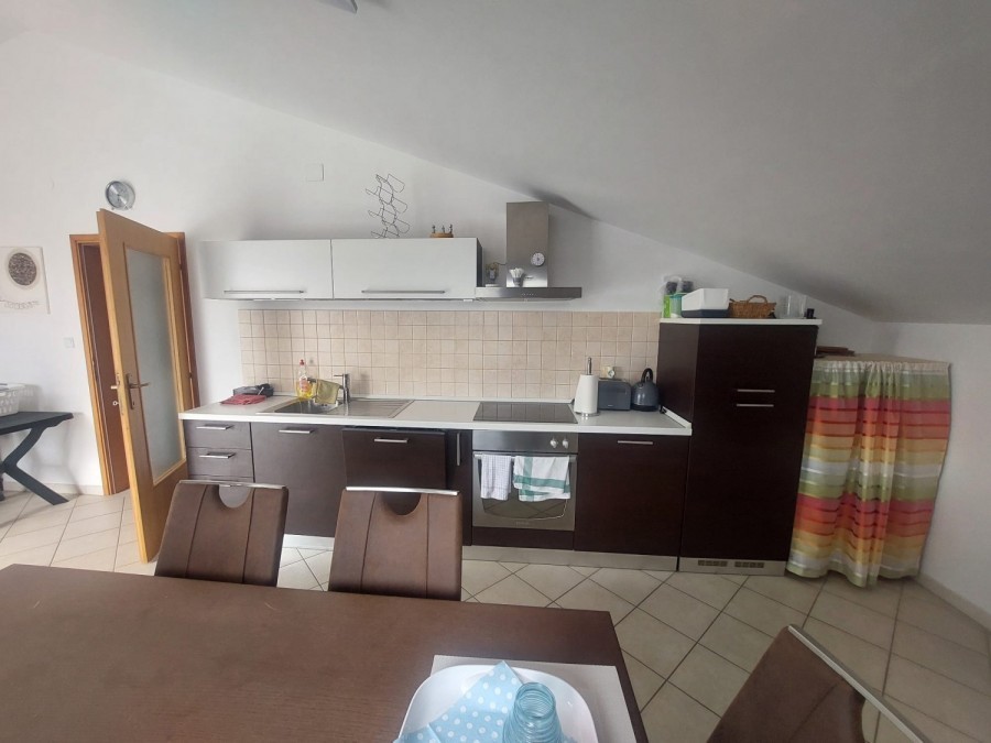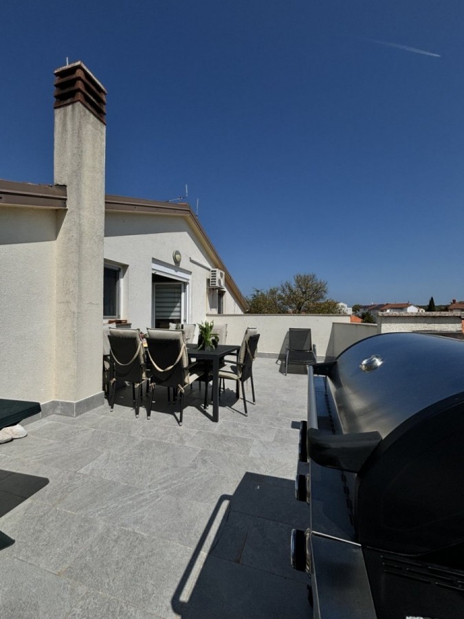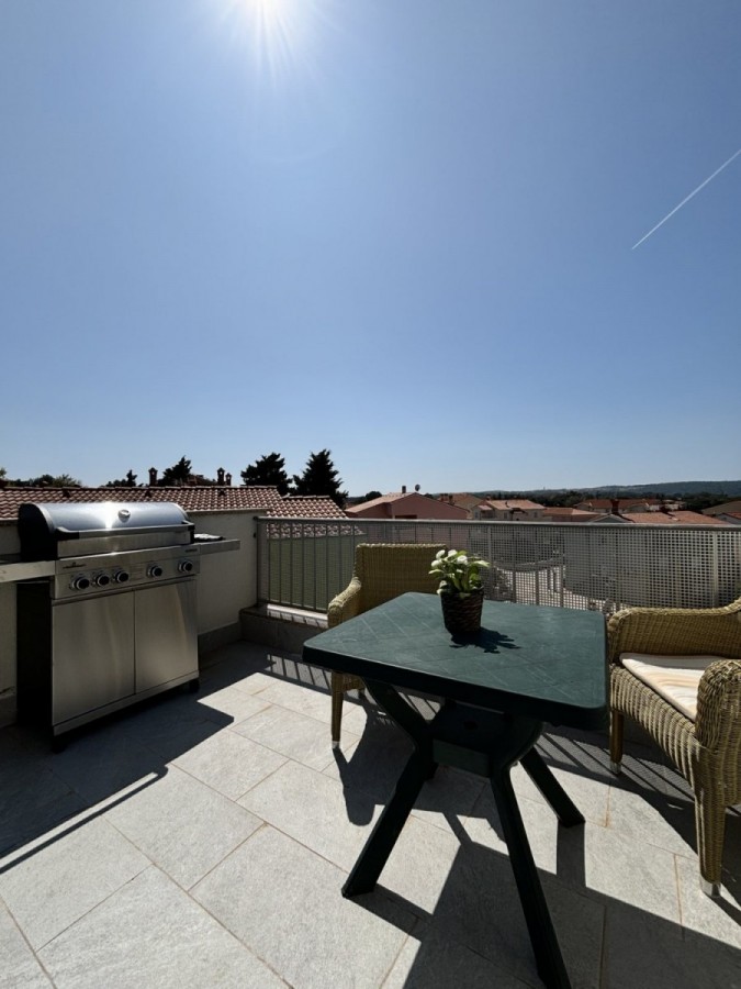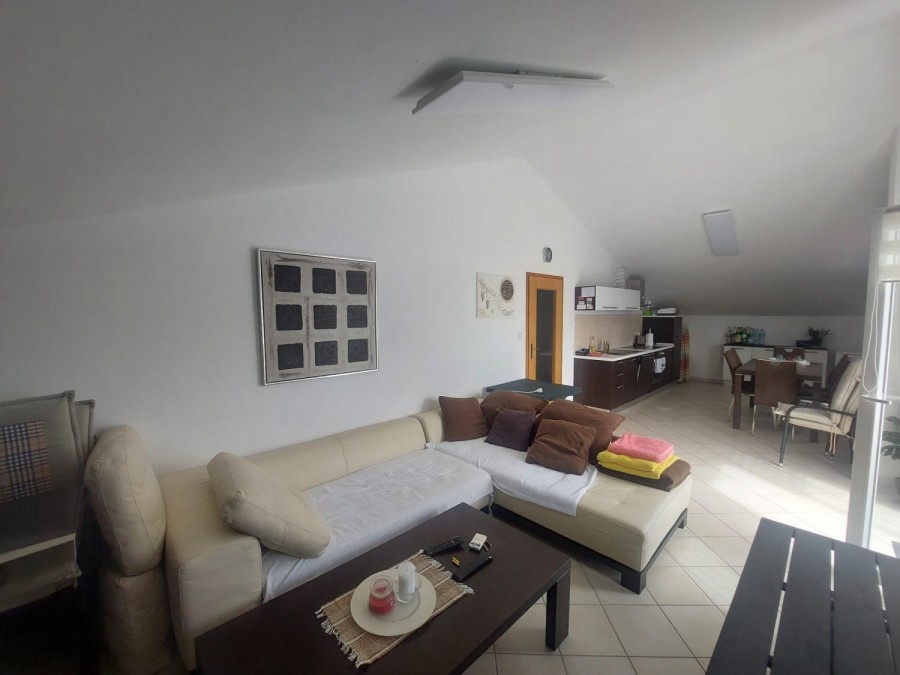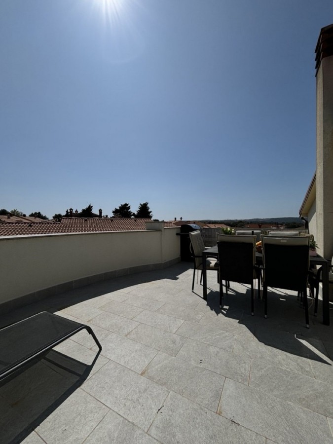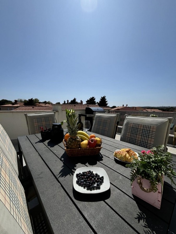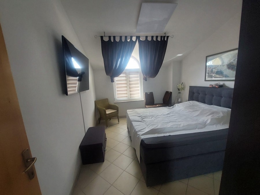 Dieses geräumige Penthouse (90 m²) erstreckt sich über die gesamte dritte (oberste) Etage eines kleinen Wohngebäudes. Es befindet sich in einer ruhigen Gegend von Medulin, nur wenige Gehminuten vom Strand und allen wichtigen Annehmlichkeiten entfernt. Die Wohnung besteht aus einem Eingangsbereich, einem Wohnzimmer mit offener Küche und Essbereich, von dem aus man auf die großzügige Terrasse mit Meerblick gelangt, zwei Schlafzimmern, einem Badezimmer und einem Abstellraum. Ein privater Parkplatz direkt vor dem Gebäude ist ebenfalls inbegriffen. Ideal für Familienwohnen oder als Ferienimmobilie. Die Wohnung ist komplett möbliert und ausgestattet und wird in diesem Zustand verkauft. Preis: 265.000 €