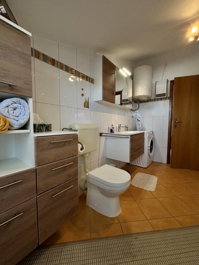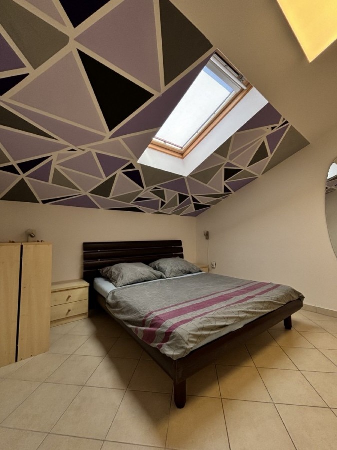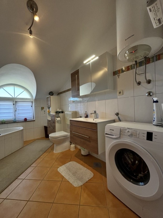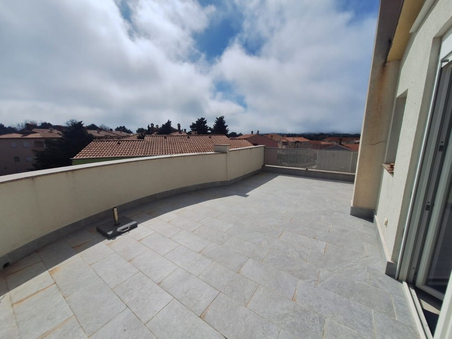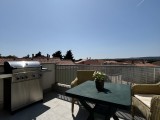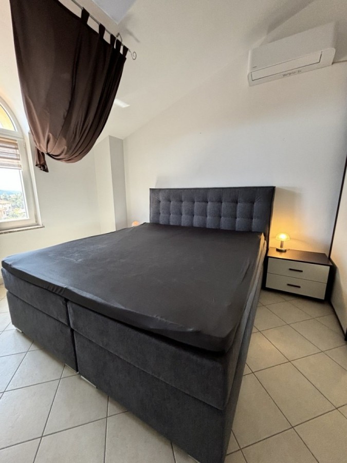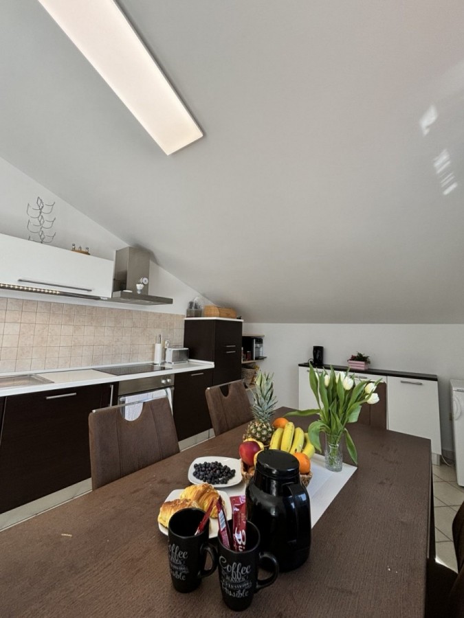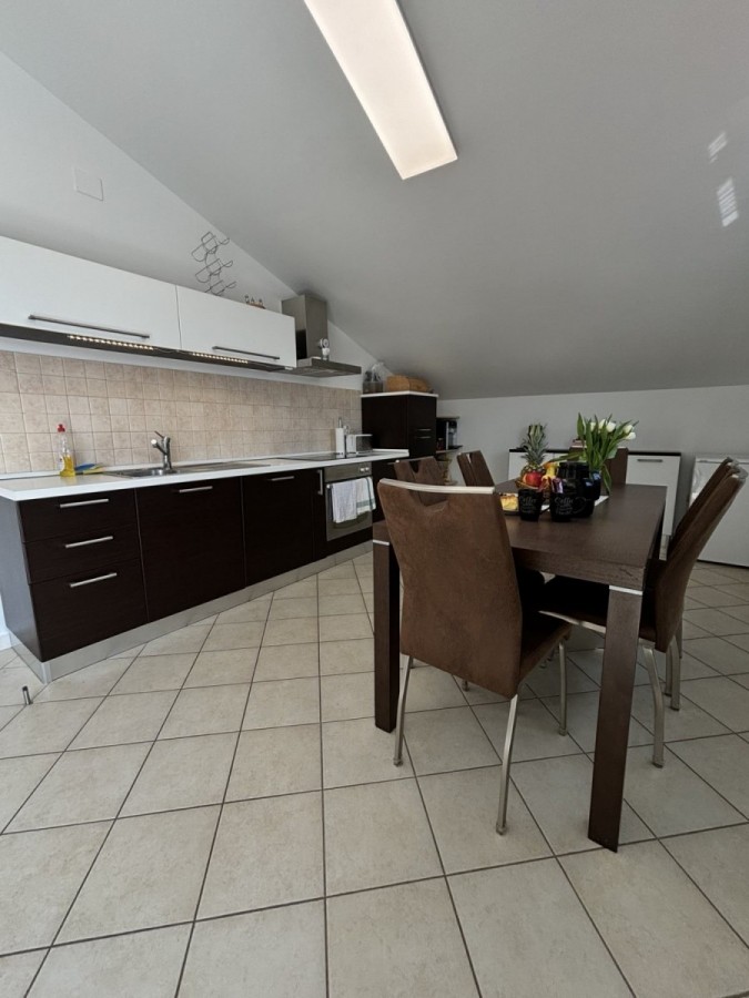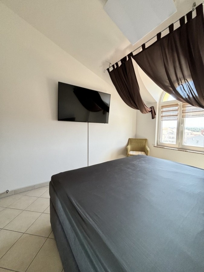 Dieses geräumige Penthouse (90 m²) erstreckt sich über die gesamte dritte (oberste) Etage eines kleinen Wohngebäudes. Es befindet sich in einer ruhigen Gegend von Medulin, nur wenige Gehminuten vom Strand und allen wichtigen Annehmlichkeiten entfernt. Die Wohnung besteht aus einem Eingangsbereich, einem Wohnzimmer mit offener Küche und Essbereich, von dem aus man auf die großzügige Terrasse mit Meerblick gelangt, zwei Schlafzimmern, einem Badezimmer und einem Abstellraum. Ein privater Parkplatz direkt vor dem Gebäude ist ebenfalls inbegriffen. Ideal für Familienwohnen oder als Ferienimmobilie. Die Wohnung ist komplett möbliert und ausgestattet und wird in diesem Zustand verkauft. Preis: 265.000 €