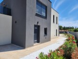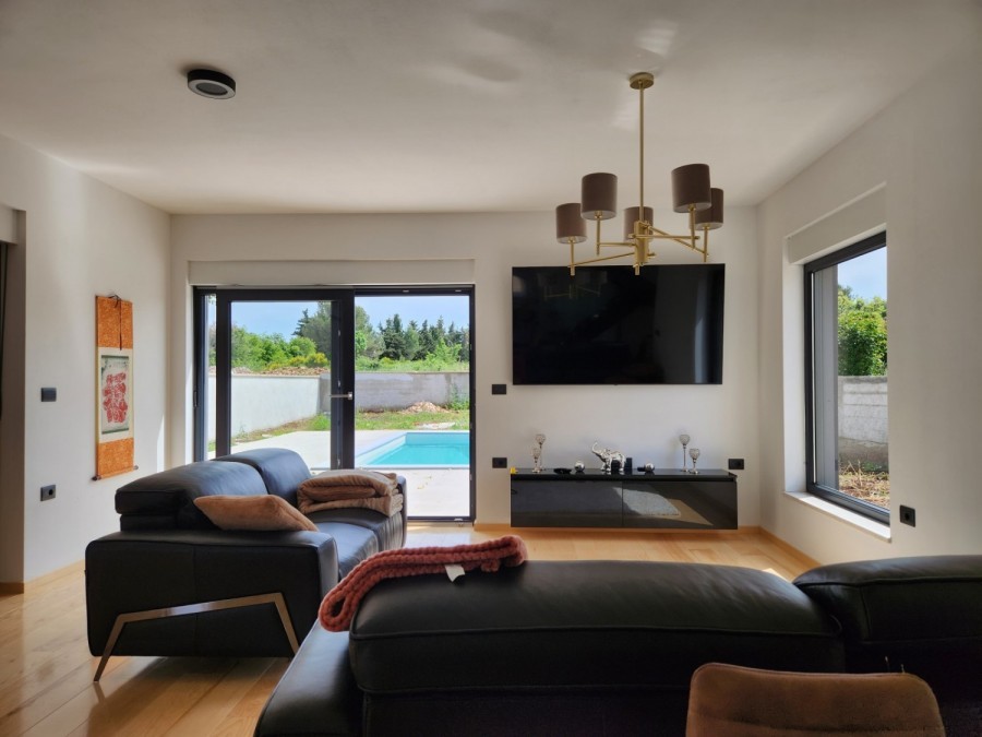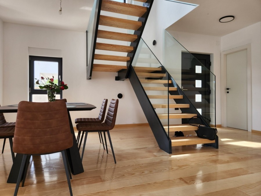 Ližnjan – Moderna samostojeća kuća s bazenom i pogledom na zelenilo Na uzvišenom dijelu Ližnjana, u mirnoj zoni naselja Dražice, u ponudi je nova i potpuno namještena moderna vila s bazenom. Idealna za obiteljski život ili kao investicija za turistički najam. Raspored: U prizemlju se nalazi prostran i svijetao dnevni boravak s velikim staklenim površinama. Kuhinja je odvojena, moderno uređena i ima izlaz u vrt. Na istoj etaži smješten je zaseban toalet i vešeraj s perilicama. Cijelo prizemlje obloženo je hrastovim parketom, a svaka prostorija ima podno grijanje. Namještaj je talijanske proizvodnje, vrhunske kvalitete. Kat: Unutarnje stepenište, ručno rađeno i obloženo hrastovinom, vodi na kat gdje se nalazi hodnik i tri spavaće sobe, svaka s vlastitom kupaonicom. Dvije spavaće sobe imaju izlaz na velike terase – jedna s privatnom terasom, a druga s terasom s pogledom na bazen i zelenilo. I na gornjoj etaži postavljen je hrastov parket s podnim grijanjem. Ugrađeni ormari su izrađeni po mjeri, ručni rad. Dodatno: Kuća ima i zasebnu ostavu s vanjskim ulazom. Trenutno je u procesu kategorizacije te je moguće iznajmljivanje već ove sezone. Lokacija: Najbliža plaža udaljena je približno 1 km, a centar mjesta oko 500 m. Grad Pula i Zračna luka Pula udaljeni su oko 13 km. Ključne prednosti: Moderna arhitektura i kvalitetna gradnja Hrastov parket i podno grijanje u cijeloj kući Kompletno opremljena talijanskim namještajem Privatni bazen i više terasa s pogledom Mirna lokacija blizu mora i centra Za više informacija i razgledavanje, slobodno se javite.
